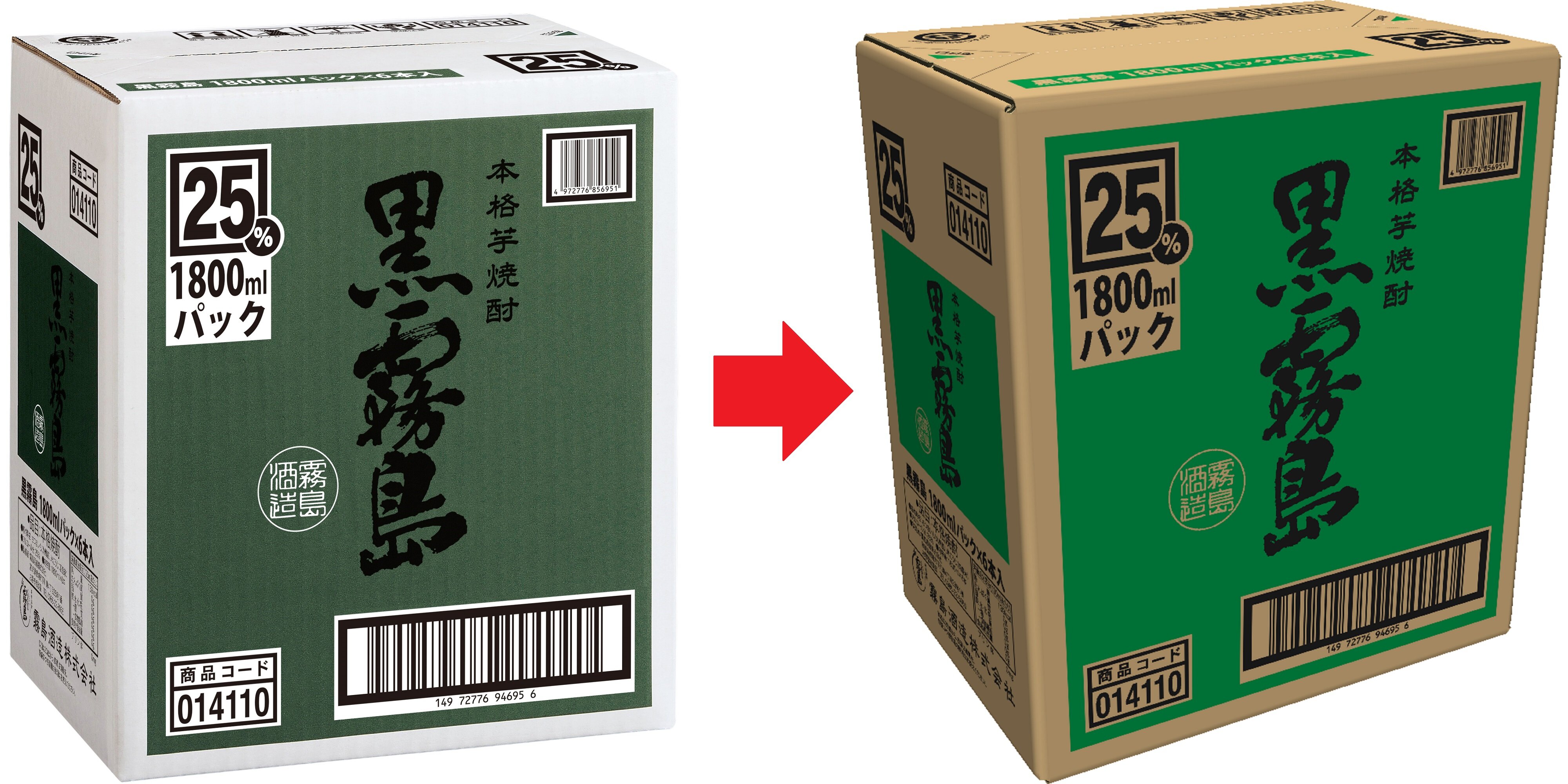 기리시마 주조 주식회사는, 본격소주의 외장 골판지로서 사용하고 있는 백색의 골판지 모두를, 보다 환경에 배려한 사양으로 변경하게 되었습니다. 지금까지도 일부 상품에서는 갈색의 골판지를 채용하고 있었습니다만, 모든 외장 골판지를 갈색으로 변경해, 2025년 6월 이후의 출하분부터 순차적으로 전환해 가겠습니다. 또, 백색으로부터 갈색으로의 전환에 의한 식별성의 저하나 바코드의 판독 불량을 막기 위해, 일부 아이템에서는 디자인이나 색미도 변경하겠습니다. 또한, 이번 사양 변경으로 강도에 미치는 영향은 없습니다.